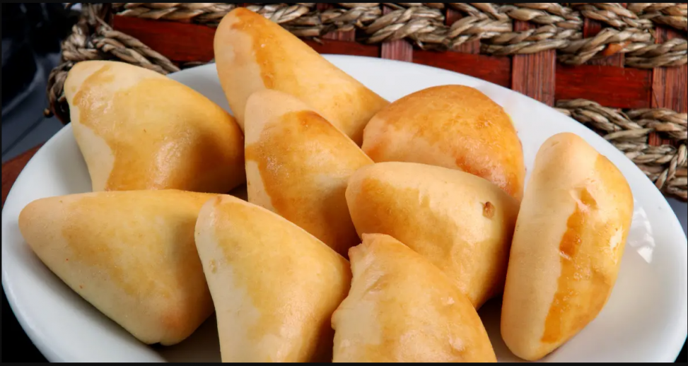 - Faça bolinhas de 30 gramas cada. Abra a massa em formato de triangulo e recheie.
